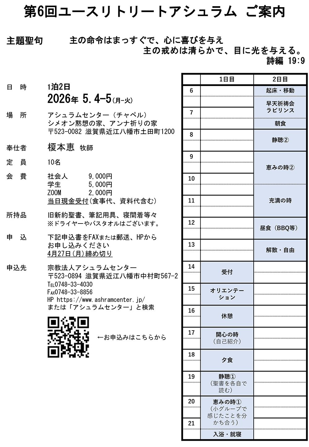 2026年5⽉4〜5⽇場所 アシュラムセンター(チャペル)シメオン黙想の家、アンナ祈りの家 〒523-0082 滋賀県近江八幡市土田町1200